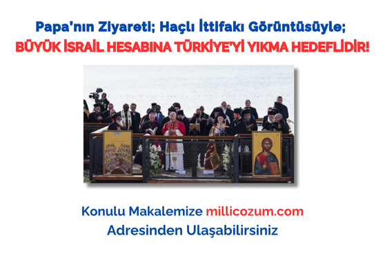 Çünkü Vatikan ve Papalık, artık tamamen Siyonizm’in kontrolüne alınmış durumdadır. “Haçlı Birliği kurmak”, “Hristiyanlığı dünyaya hâkim kılmak”, “Hz. İsa’nın yeryüzüne tekrar dönüşüne zemin hazırlamak” gibi sloganlar, Hristiyan ülkeleri Siyonizm’in dünya hâkimiyeti hedefine hizmet ettirmek için kullanılmaktadır. Bu gerçeği en net bilgiler ve belgelerle hatırlatan Erbakan Hocamızdır. Şimdi Papa’nın Türkiye ziyaretini, sadece Haçlı hayalleri çerçevesinde yorumlamak, dolaylı da olsa Siyonizm’in şeytani heveslerine katkı sunmaktır; Kuduz İsrail’in ve uyuz işbirlikçilerin işini kolaylaştırmaktadır.