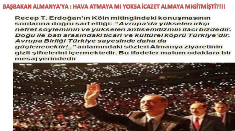 Recep T. Erdoğan’ın Köln mitingindeki konuşmasının sonlarına doğru sarf ettiği: “Avrupa’da yükselen ırkçı nefret söyleminin ve yükselen antisemitizmin ilacı bizdedir. Doğu ile batı arasındaki ticari ve kültürel köprü Türkiye’dir. Avrupa Birliği Türkiye sayesinde daha da güçlenecektir!..” anlamındaki sözleri Almanya ziyaretinin gizli şifrelerini içermektedir. Bu ifadeler malum odaklara bir mesaj yerindedir ve açılımı şöyledir:
