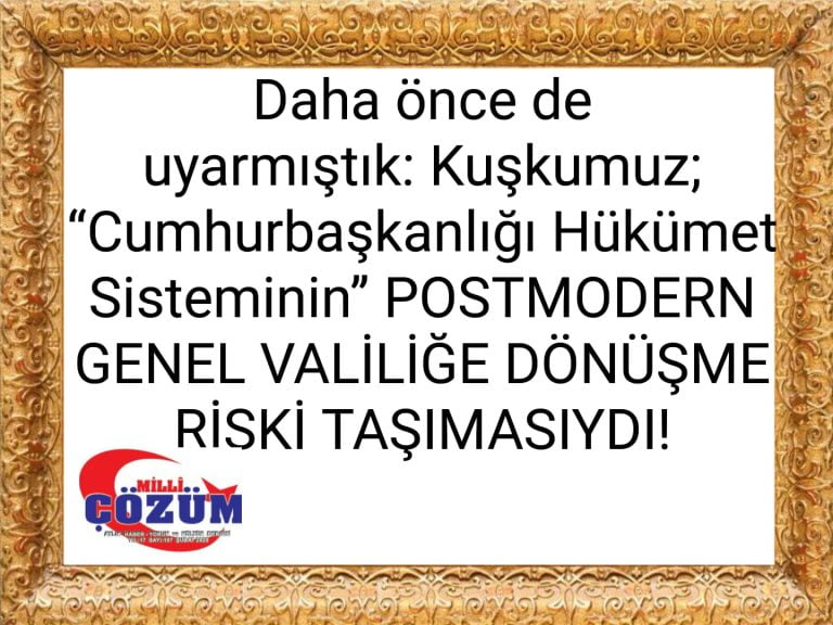 Daha önce de uyarmıştık: Kuşkumuz; ”Cumhurbaşkanlığı Hükümet Sisteminin” POSTMODERN GENEL VALİLİĞE DÖNÜŞME RİSKİ TAŞIMASIYDI!