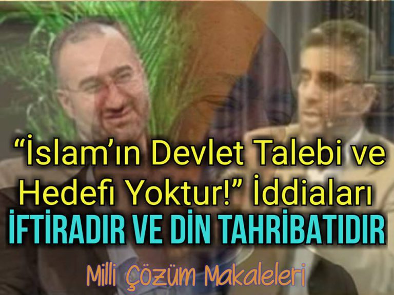 İslam’ı; kapitalist ve sosyalist rejimlerin veya diktatörlüklerin aksesuarı olarak kullanmak isteyen şeytani kesimler: “Hz. Peygamberin bir devlet kurmak için görevli kılınmadığını ve İslam’ı yaşamak için bir devlete ihtiyaç duyulmadığını” ortaya atmışlardır. Bu iddialar, Kur’an’ın hikmetine ve Resulûllah’ın hedeflerine tamamen aykırı saptırmalar ve safsatalardır. Son zamanlarda Mustafa İslamoğlu gibi bazı bilgiçlik budalalarının; “Yürek Devleti”, “Kalpleri fethetme ve güzel ahlakı yerleştirme seferberliği” gibi cafcaflı laflar arkasında, İslam’ın Kâmil Sistem, Adil Düzen, Fadıl Devlet ve Hükümet kavramlarını ve kurumlarını laçkalaştırma ve gereksiz sayma çabaları yoğunlaşmıştır. Bütün bunlar, aslında bir zamanlar Fetullah Gülen’e yaptırılmaya çalışılan ve yine bu maksatla AKP’yi Milli Görüş’ten koparıp iktidara taşıyan, malum ve mel’un odakların dayattığı “Ilımlı İslam” sapkınlığının farklı yansımalarıdır. Bu adamlara sormak lazımdı: Kur’an’ın, “Sizin için kısasta (haksız yere öldürdüğü kişiye karşı katilin idam olunması hükmünün uygulanmasında) hayat vardır” gibi emirlerini, eğer Adil bir Devlet yoksa kim uygulayacaktır? Bu iş; mahalle meclislerine, cami cemaatine veya kabile reislerine mi bırakılacaktır. Hak ve adaleti esas alan bir devletin olmadığı yerde, fertler ve aşiretler mi bu hükümleri tatbikata koyacaktır?