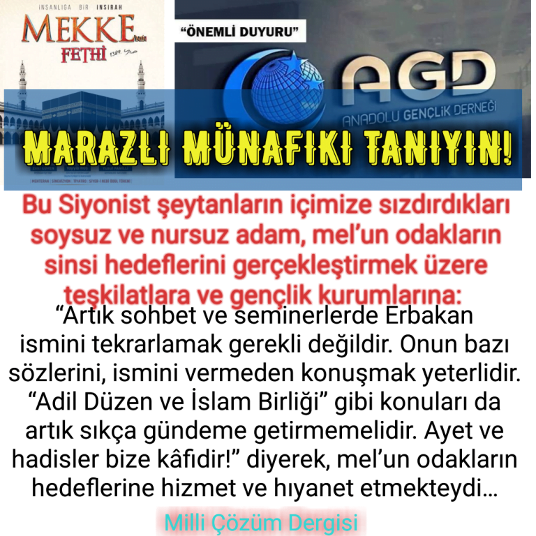 Not: Şeytanların şakirdi ve insan suretli takipçileri olan Siyonist odaklar: Erbakan’ı öldürmek yetmez, üzerine beton dökmemiz lazım!” demişlerdi. Çünkü ülkemizde ve yeryüzündeki zulüm, zillet ve sömürü sistemlerini değiştirecek ve ADİL DÜZEN’i getirecek kutlu projeleri sadece Erbakan üretmiş ve uygulamaya girişmişti… Bu Siyonist şeytanların içimize sızdırdıkları soysuz ve nursuz adam, mel’un odakların sinsi hedeflerini gerçekleştirmek üzere teşkilatlara ve gençlik kurumlarına: “Artık sohbet ve seminerlerde Erbakan ismini tekrarlamak gerekli değildir. Onun bazı sözlerini, ismini vermeden konuşmak yeterlidir. “Adil Düzen ve İslam Birliği” gibi konuları da artık sıkça gündeme getirmemelidir. Ayet ve Hadisler bize kâfidir!” diyerek, mel’un odakların hedeflerine hizmet ve hıyanet etmekteydi… Bunlara kapılan gafil, cahil ve gayretsiz kimseler de artık bütün toplantılarında Erbakan ismini ve projelerini terk etmişlerdi. Bunların vefasızlık ve vasıfsızlığı, bizzat davamızı satıp ayrılanlardan daha bayağı ve aşağı bir vaziyettir. Yılbaşı programlarının hepsinde bu talihsiz tavrın sergilenmesi, marazlı mantığın aynı merkezden şırınga edildiğini göstermekteydi. Ne diyelim, hainlere ve gafillere yazıklar olsun! Ama yakındır, Allah hainlerin de gafillerin de içini dışa dökecek ve hak ettiklerini verecektir.