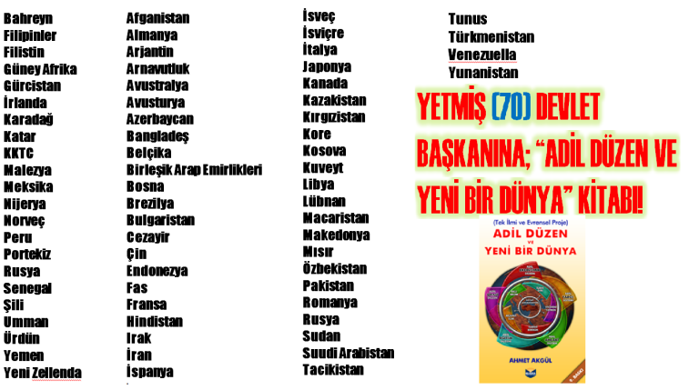 YETMİŞ DEVLET BAŞKANINA; ”ADİL DÜZEN VE YENİ BİR DÜNYA” KİTABI!